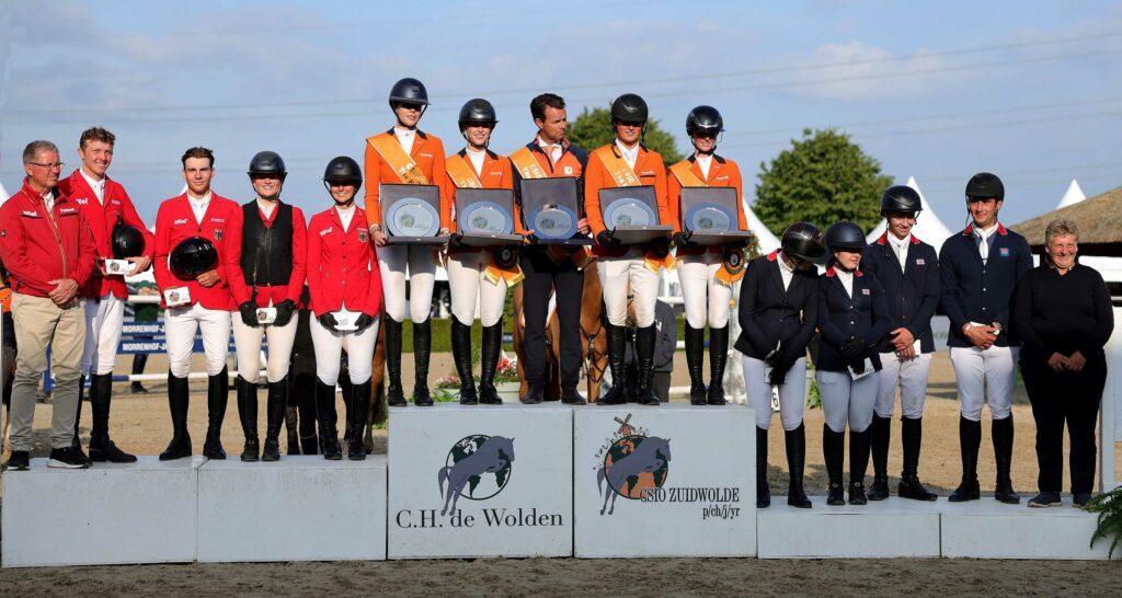 De prijsuitreiking bij de Young Riders met in het midden het winnende Nederlandse team. Links Duitsland dat tweede werd en rechts Groot-Brittannië op de derde plaats (Foto: Hans Khoe)
